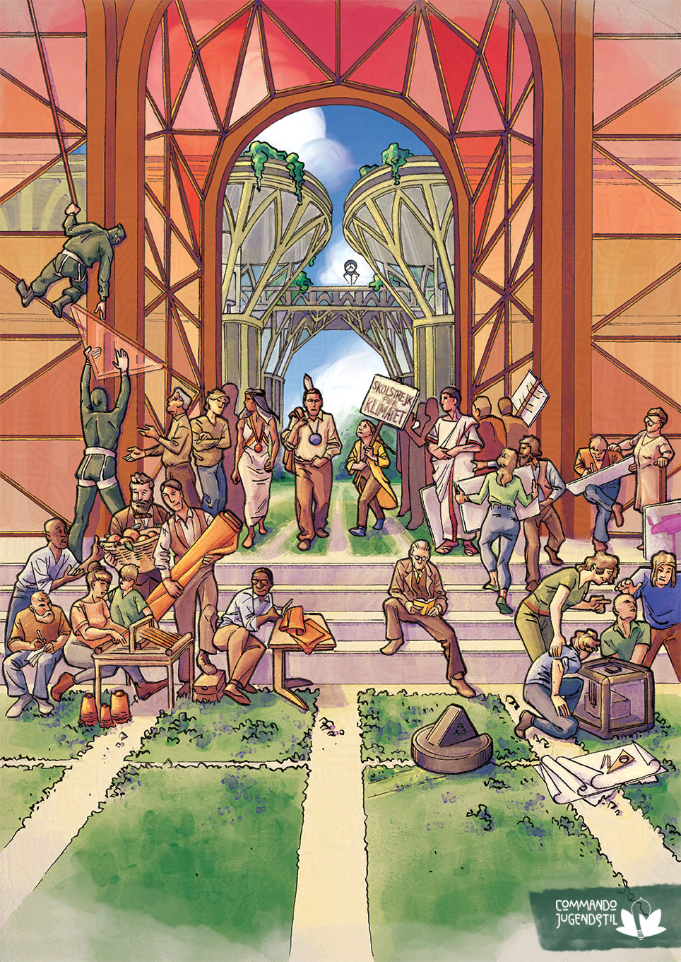 The people are divided in several groups dedicated to different activities, all sharing the same purpose of merging art, nature and tech. So in the lower left corner we have the workshop of orange silk production, a new type of textile fibre obtained by the manufacturing of the cellulose contained in the orange peel. In this group of people you can see a lady using a portable loom and William Morris, one of the founders of the Arts and Crafts and of the Socialist movements in the UK. He was also a writer, a publisher and an artist and in this composition he is bringing to the workshop the oranges from his farm.