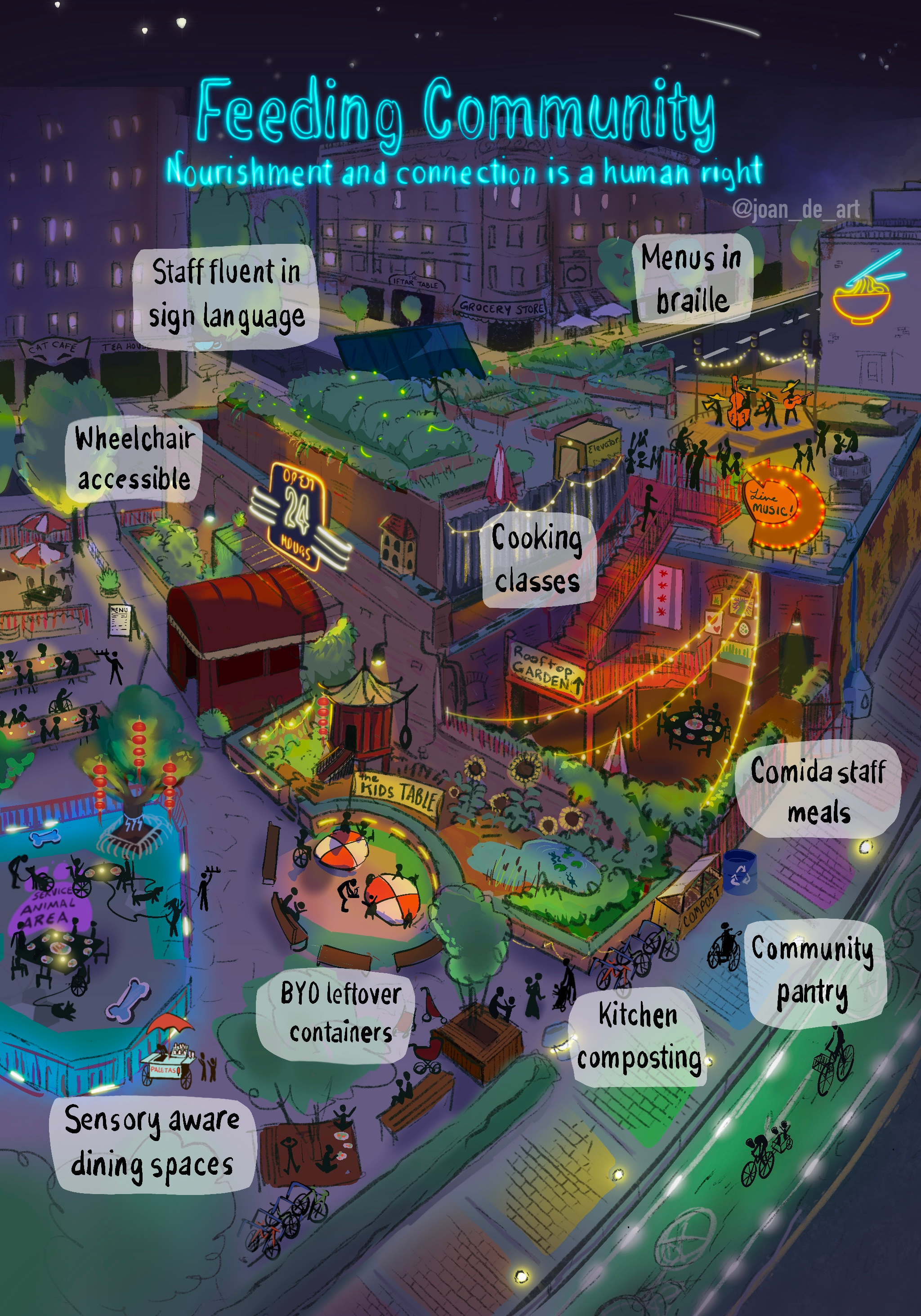 Food became much more localized and seasonal, we built relationships with local farmers and rooftop gardens. No longer did we waste food at the end of a shift, but a community pantry ensured that everybody had enough to eat.