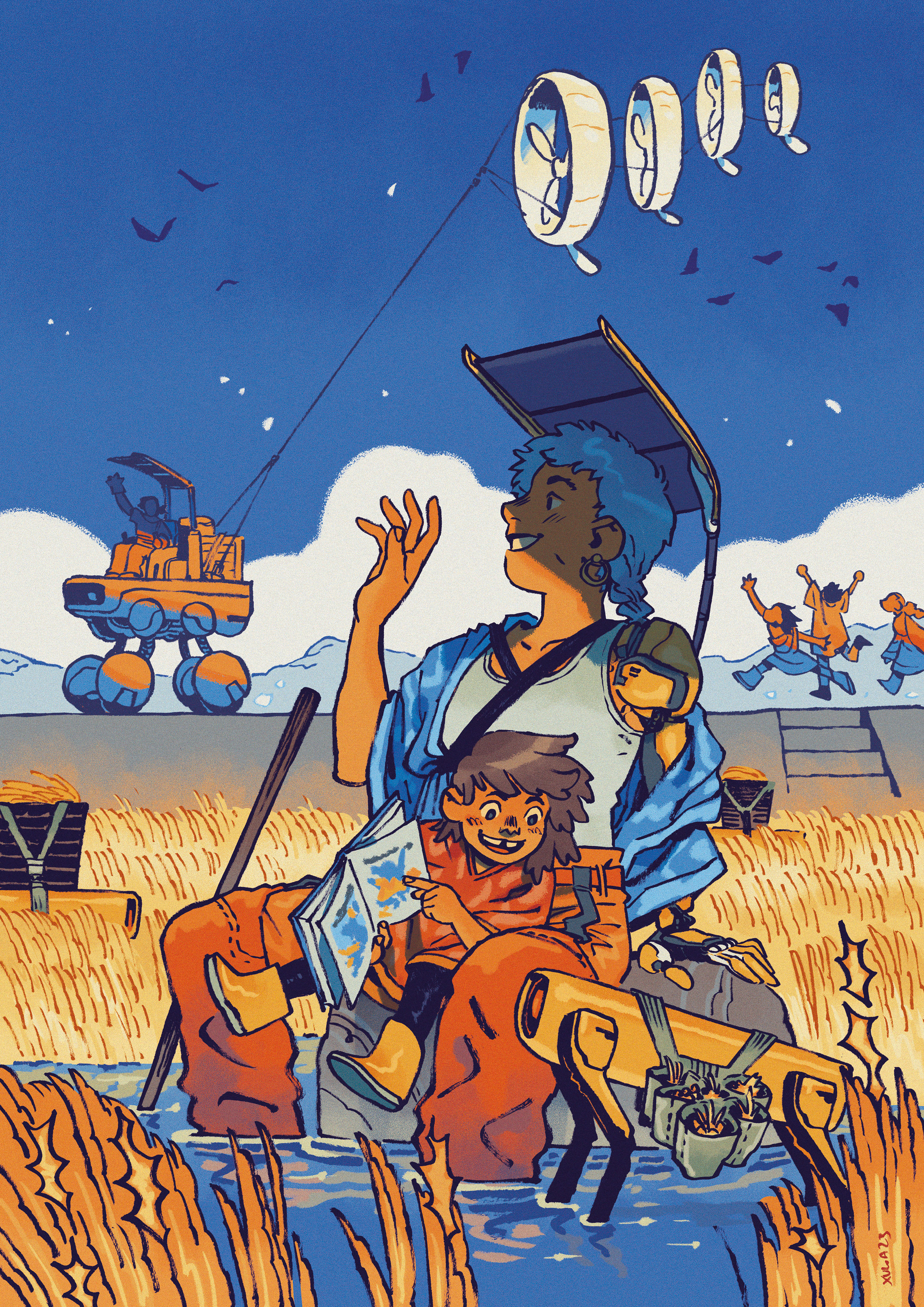 Solarpunk scene on a sunny wheat field, where some small robots do the harvest while a kid is reading on a woman’s lap. The community works on building wind energy while also having some free time to enjoy themselves. All three elements of the title are reunited and sourced sustainably in the image.