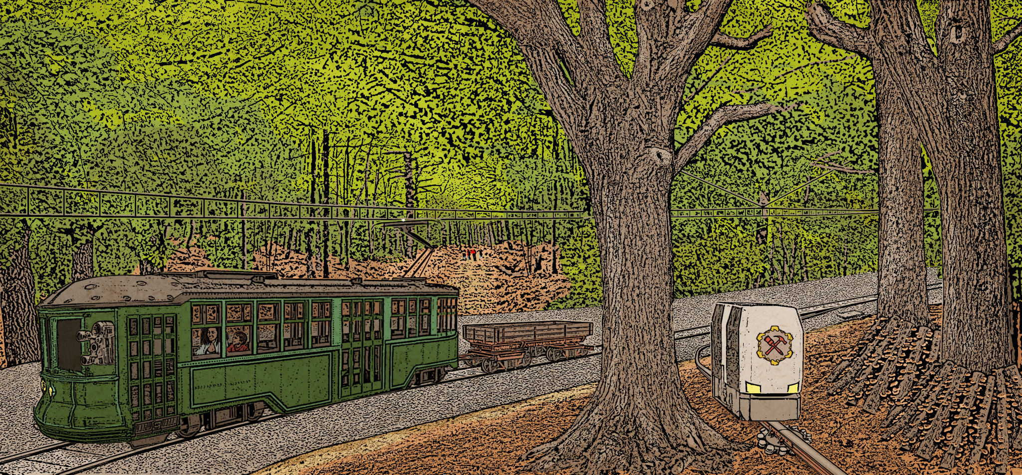 His design is based on ones from the late 1800s and early 1900s with the idea that they would be an easier starting point for a rebuilding society, though some other modernizations have been made. He uses a modern pantograph rig and overhead wire, and much of the deck has been lowered to improve accessibility.